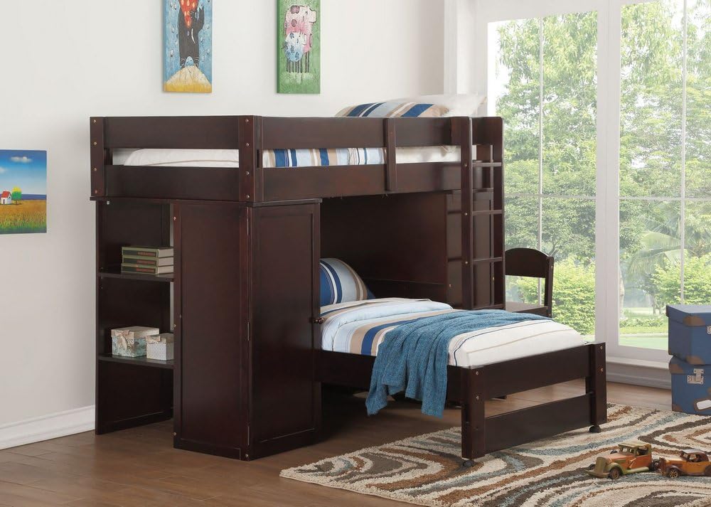 Acme furniture acme lacey loft twin bed with desk, chest and bookcase in espresso finish 37660. Enjoy free shipping on most stuff, even big stuff. Six drawer dresser end with integrated shelving. Ladder and dresser ends are completely modular and can be positioned on either the it's a really good deal considering that you get a bed with a separate bookshelf and dresser.
